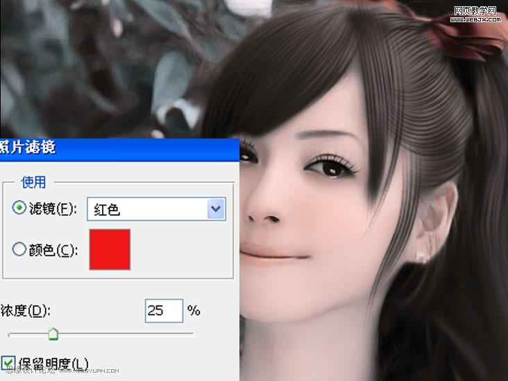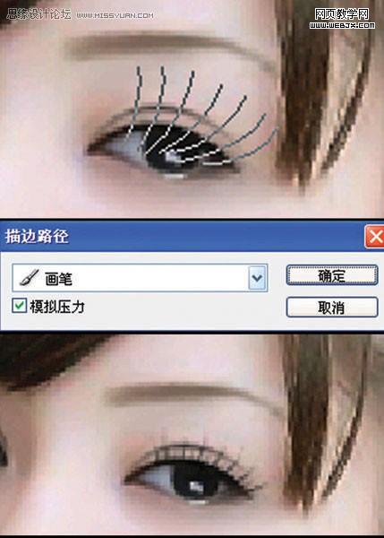 4.給人物的眼睛畫上眼睫毛,新建一層空白層,用鋼筆工具勾出睫毛路徑,右擊—描邊路徑,選畫筆(畫筆為1像素),模擬壓力打上勾。用像皮擦擦去不需要的部分,再適當的模糊一些。