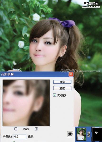 6.新建圖層,ctrl+shift+alt+e蓋印圖層,執行濾鏡—模糊—高斯模糊。半徑為4.2像素,按住ctrl鍵,鼠標左鍵點擊快速蒙板,選白色畫筆在人物的皮膚上適當的涂抹,達到磨皮美白的效果。如下圖: