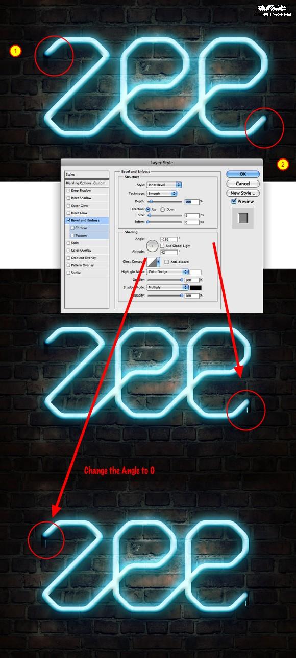跟著以下的圖片,調整圖層樣式的設置。我們將使用投影,內陰影,外發光,浮雕效果,顏色疊加的效果。