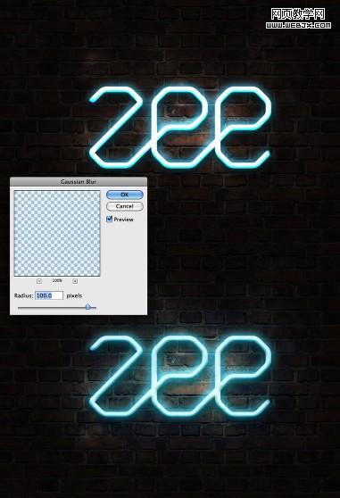 輸入你想制作使用的類似氖氣效果的logo字樣,這里我使用的字母zee來創建教程。復制圖層,隱藏它,因為我們教程后續步驟中需要幾份副本,選擇可視的logo圖層,選擇:濾鏡-- 模糊--高斯模糊,半徑是15像素。