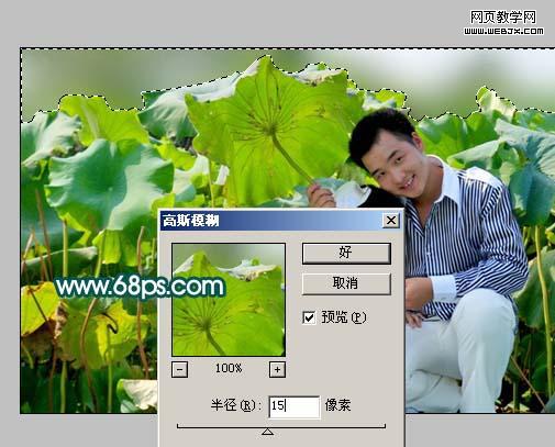2、執行:濾鏡 > 模糊 > 高斯模糊,數值為15,確定后不需要取消選區。