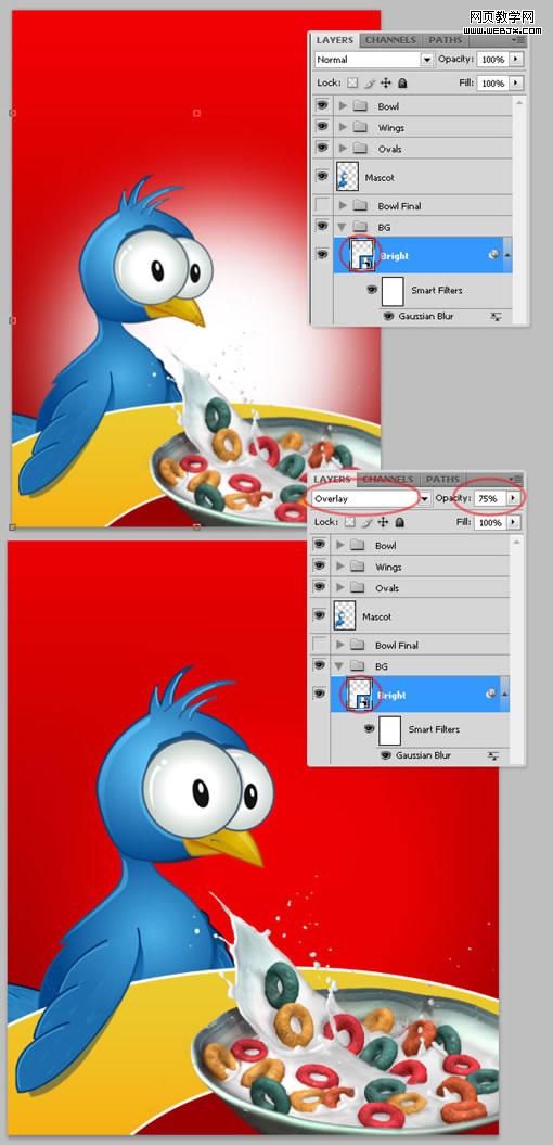 在上一步驟創(chuàng)建的漸變圖層上創(chuàng)建一個圓,對其增加一個高斯模糊效果并且把它的混合方式改為覆蓋,不透明度改為75%左右,現(xiàn)在你的背景變亮了一些。