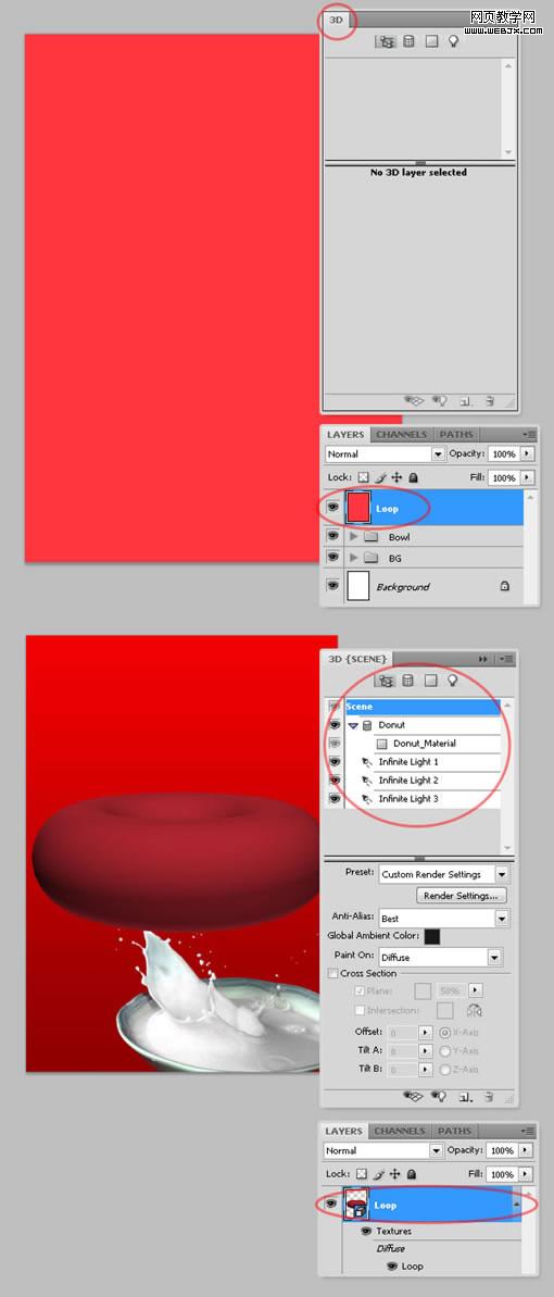 接下來選擇:window > 3d以顯示3d工具面板,現(xiàn)在選擇3d > new shape from layer > donut來自動創(chuàng)建一個名為“loop”的3d圖層,將它放在這,我們進(jìn)行下面的步驟。