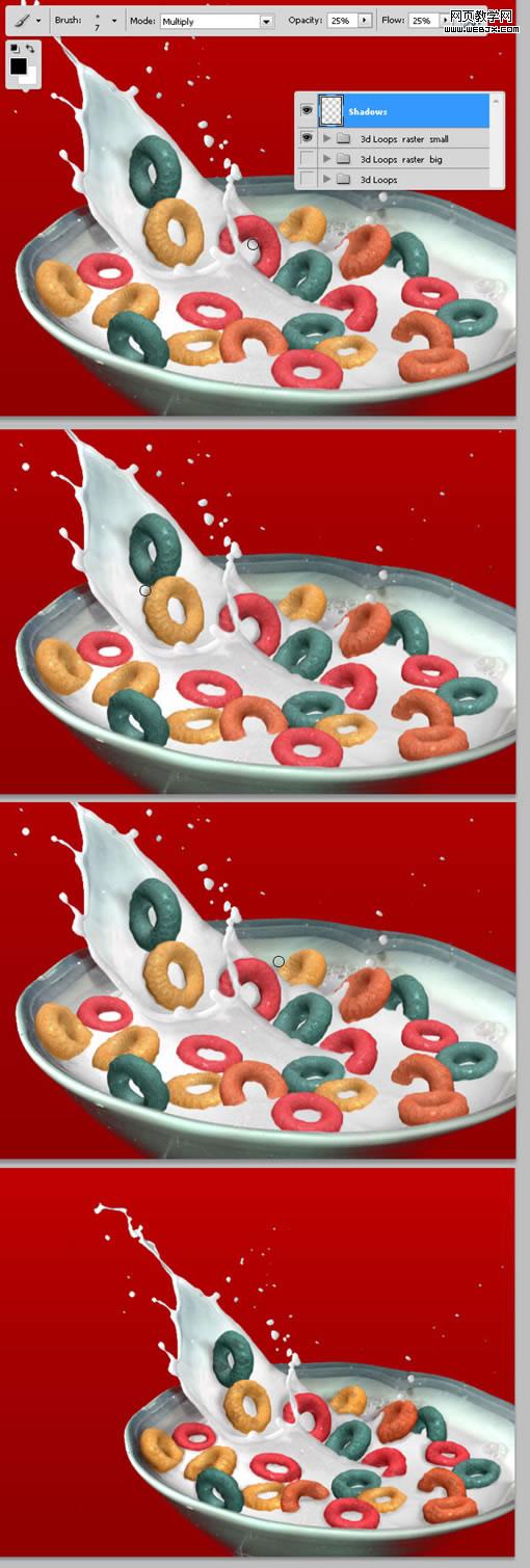 抓取任一甜麥圈拖動到牛奶碗的上方,試著使它覆蓋牛奶濺出的部分。然后選擇上述甜麥圈,然后添加一個顯示全部的圖層蒙版。選擇這一蒙版并選取小一些的畫筆,將甜麥圈沒入牛奶中的部分隱藏,對所有甜麥圈重復(fù)上述動作。這可能是整個教程中最困難的地方,因為你要不斷的改變甜麥圈的擺放。