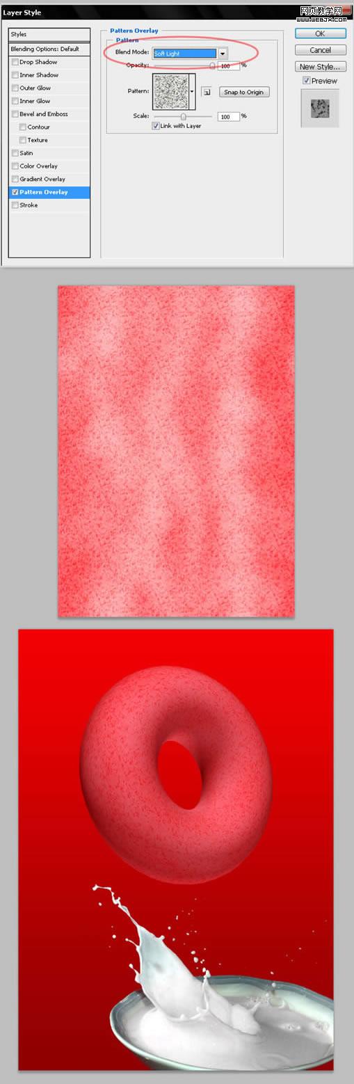 盡管我們將它創(chuàng)建在一個粉紅色的圖層上,但是現(xiàn)在甜麥圈看起來有一點暗,這是因為它的周邊顏色被默認(rèn)為黑色的緣故。點擊color box 將其變?yōu)樯罴t色((#7e0001),現(xiàn)在甜麥圈看起來好多了,但是我們還有很多要做的。