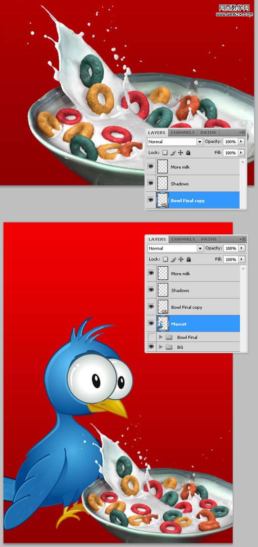 合并“bowl final”文件夾,然后將吉祥物的圖案粘貼到牛奶碗的后面。