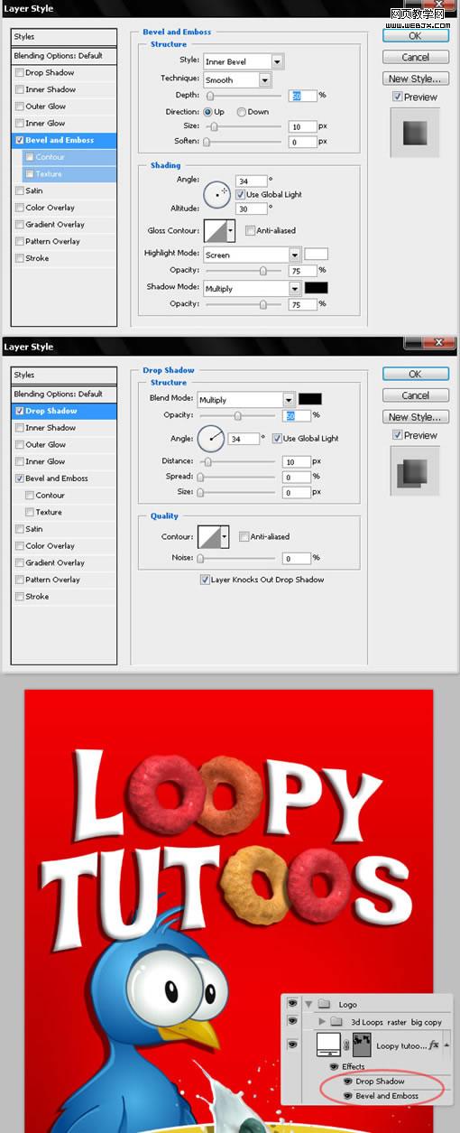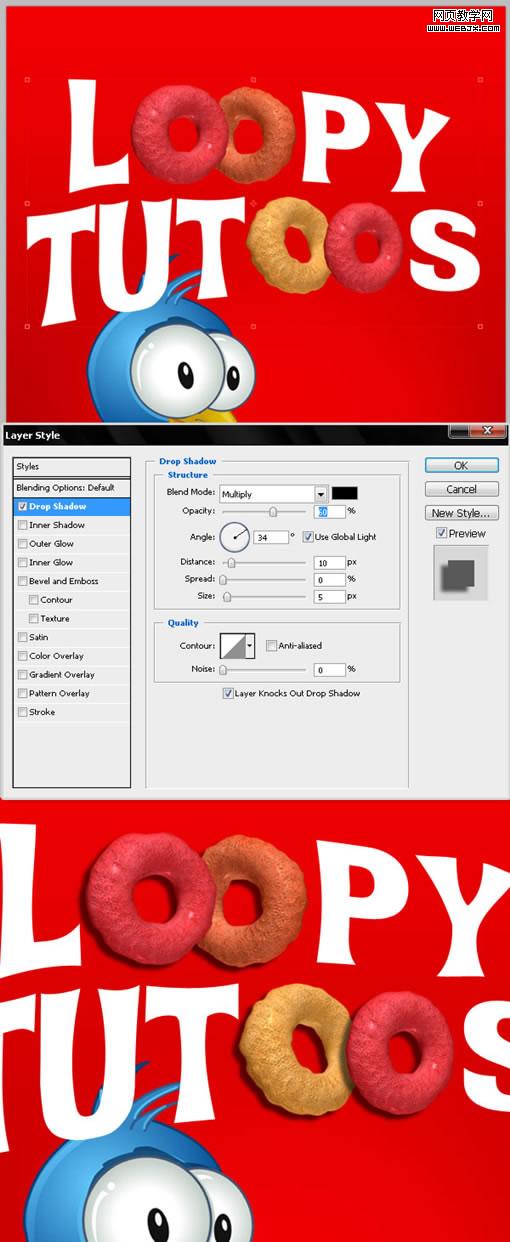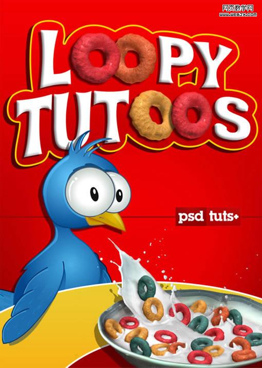 還記得第二十步中的“3d loops raster big”文件夾么?現(xiàn)在又到了用它的時候了,使該文件夾可見,將它復(fù)制并且將其置于最上層。然后選擇4個甜麥圈,刪去其他,然后用甜麥圈取代原來“o”的位置。