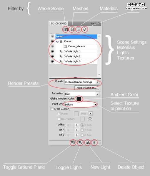 在我們繼續(xù)之前你首先要熟悉一下3d面板。所有的3d對象都包含在scene這個界面中,每個scene中可能有好幾個3d對象,比如含有不同紋理和光線的網(wǎng)狀物。你可以把你想要的3d對象都放進(jìn)一個scene里面。