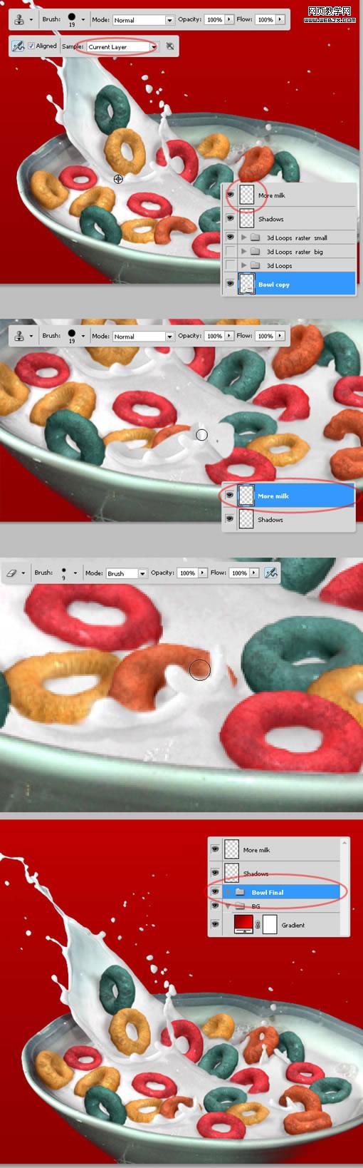 作為最后的步驟,合并“bowl”圖層(參見第三步),用仿制圖章工具復(fù)制一些濺出牛奶的區(qū)域到一個新的圖層,將圖層置于最上層并命名為“more milk”。這個很容易,按住仿制圖章工具,選擇被光柵處理過的“bowl”圖層并且按下alt鍵,然后點擊濺出牛奶的部分作為仿制圖章的源。確保樣本選擇的是當(dāng)前圖層,然后選擇“more milk”圖層,開始在任何位置涂色。最后用一個小橡皮擦擦去多余的牛奶。
