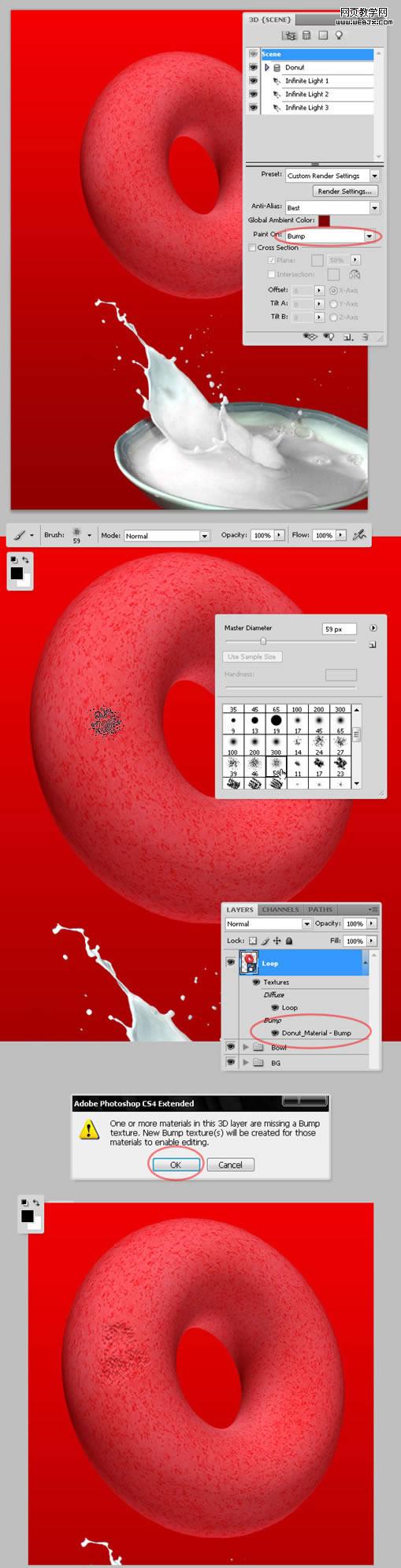 現(xiàn)在你的甜麥圈看起來有點像下圖中的最后一張了。這一步很終于因為我們馬上將會再進(jìn)行很多次3d變換。在繼續(xù)之前,請再多練習(xí)一下網(wǎng)格選項中的有關(guān)功能。記住photoshop不是一款構(gòu)造3d建模軟件,所以如果你要修改網(wǎng)格本身的話還要借助其他的軟件。