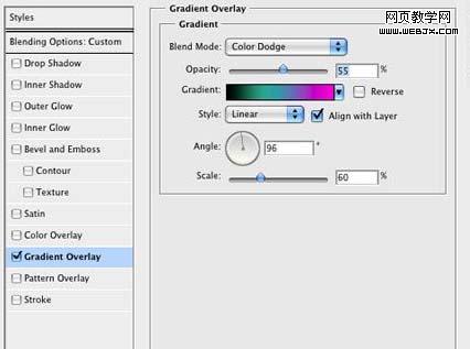 9、在云彩圖層上方雙擊打開圖層樣式對(duì)話框。首先要做的是,將混合模式設(shè)置成正片疊底,填充不透明度設(shè)置成28%。然后到漸變疊加。混合模式設(shè)置成顏色減淡,不透明度設(shè)置成55%。使用下圖所示的顏色。