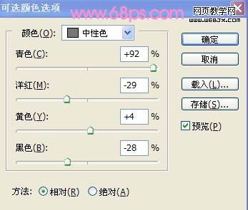 2、創(chuàng)建可選顏色調(diào)整圖層,參數(shù)設(shè)置如圖3 - 7,效果如圖8。