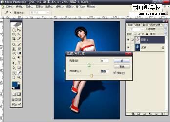4.添加光照效果。執行濾鏡中的“光照效果”命令為圖像添加特殊效果。如圖13所示。并執行“亮度/對比度”命令調整圖像的反差。如圖14所示。