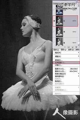 3、分別調(diào)整通道的色彩。使用“應(yīng)用通道”命令,分別對(duì)紅、綠兩個(gè)通道進(jìn)行調(diào)整,以增加圖像的反差。點(diǎn)擊通道面板,單擊紅通道,并選擇“應(yīng)用圖像”命令。如圖3所示。在紅色通道面板中,將通道改為“綠”,并將“混合”改為“柔光”,如圖4所示。再單擊通道面板中的綠通道,同樣使用“應(yīng)用圖像”命令,將通道改為“藍(lán)”,并將“混合”改為“柔光”,如圖5所示。