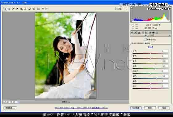 6. 提高畫面色彩的明亮度。在“hsl/灰度面板”上打開“明亮度面板”,設置“黃色”值為“30”,“綠色”值為“20”,其它設置保持默認值,提高畫面色彩的明亮度,如圖2-7所示。