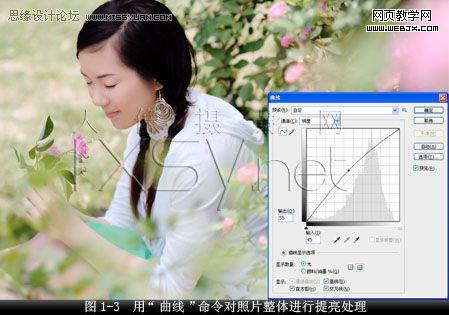 2.用曲線工具對照片進行提亮調整。在彈出的“曲線”對話框中,“預設”為“自定”,“通道”為“明度”,勾選“預覽”項,打開“曲線顯示選項面板”,按“小網格”按鈕以10%增量顯示詳細網格(以便做到精確調整),其它設置為默認值。設置“輸出”值為“55”,“輸入”值為“45”,從而對照片整體進行提亮處理,調整后的圖片如圖1-3所示。
