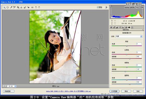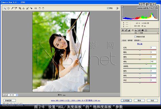 4. 強調著重黃綠色調。在“camera raw編輯器”對話框中打開“hsl/灰度面板”設置“色相面板”上“黃色”值為“10”,“綠色”值為“20”,其它設置保持默認值,加強自然色彩的純度,著重黃綠色調,如圖2-5所示。