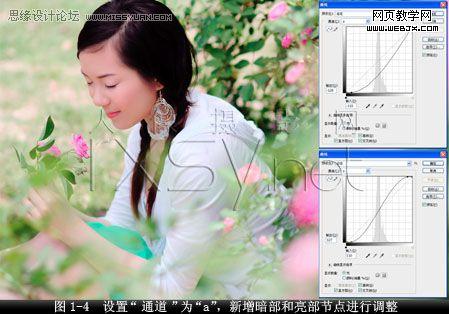 3.調整a通道的曲線,增強畫面色彩。設置“通道”為“a”,新增左邊暗部節點“輸出”值為“-128”,“輸入”值為“-110”,接著,新增右邊亮部節點“輸出”值為“127”,“輸入”值為“110”,畫面的色彩有所提高,人物肌膚也清透起來,如圖1-4所示。