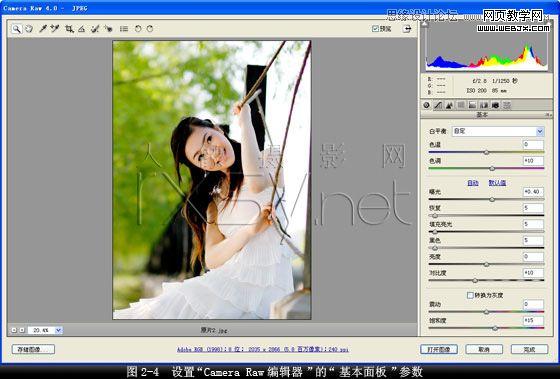 3. 調整圖像的光亮度和色澤度。在打開的“camera raw編輯器”對話框中,根據原片的特點,我們確定“基本面板”上“色調”值為“10”,“曝光”值為“0.40”,“恢復”值為“5”,“填充亮光”值為“5”,“黑色”值為“5”,“對比度”值為“10”,“飽和度”值為“15”,其它設置保持默認值,即改變圖像的光亮度和色澤度,如圖2-4所示。