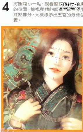 4、將圖縮小一點,觀看整個眼神、輪廓的位置。檢視整體的感覺。這里我用紅點大概標出五官的分布位置。