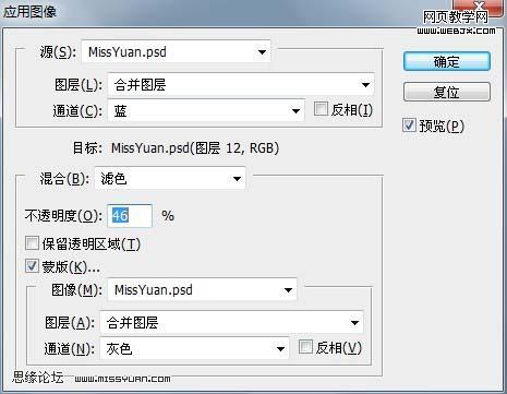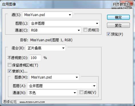 8、蓋印圖層得到圖層9,進(jìn)行圖像-應(yīng)用圖像,參數(shù)如圖: