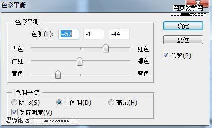 使用套索工具選中眼睛上部分的眼影部分,建立色彩平衡調(diào)整層參數(shù)如圖: