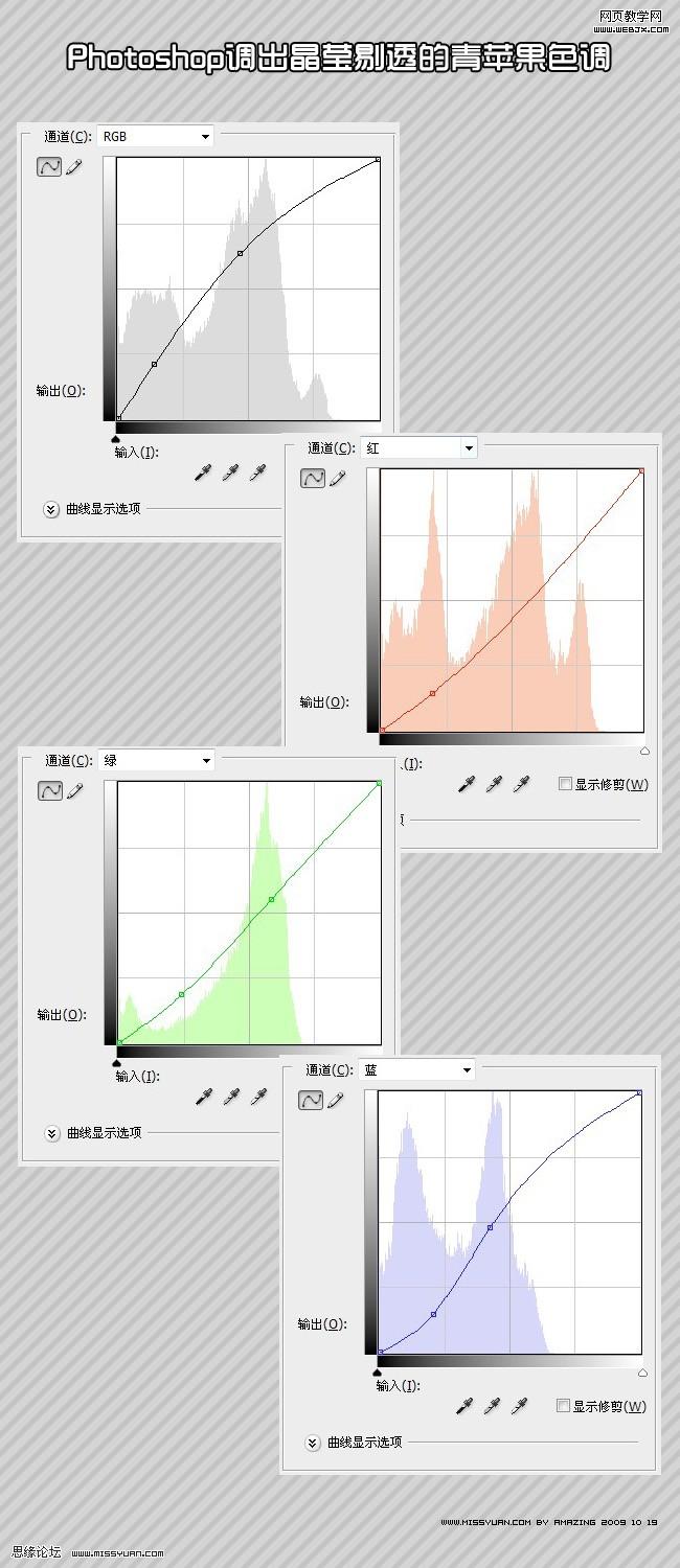 2.建立曲線調整層,分別對幾個通道進行調整,如圖: