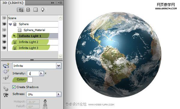 第十步:"infinite light 3"是放在球體下面的某處的,因為我們接下來要將球體放在一個表面上并且要加上投影,所以我們不希望有任何光源在球體的下方,所以用3d工具將光源放到球體的上方。