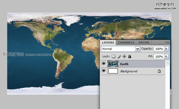第二步:我們接下來將要使用地球的貼圖。你可以從 planetpixelemporium.com下載到"color map"這一圖片,然后將它放到你的文檔中作為一個新的圖層。將這個圖層重命名為"earth“。