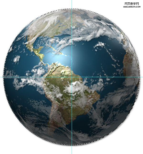 第十四步:現在我們的星球已經完成了,因為在繼續之前我們要合并我們的兩個圖層,現在是你調整地球和云層角度的最后機會了。畫出水平和垂直的兩條參考線,使它們相交在地球的中心。在圖層面板中同時選擇earth和clouds圖層,將它們合并,名且命名為earth。