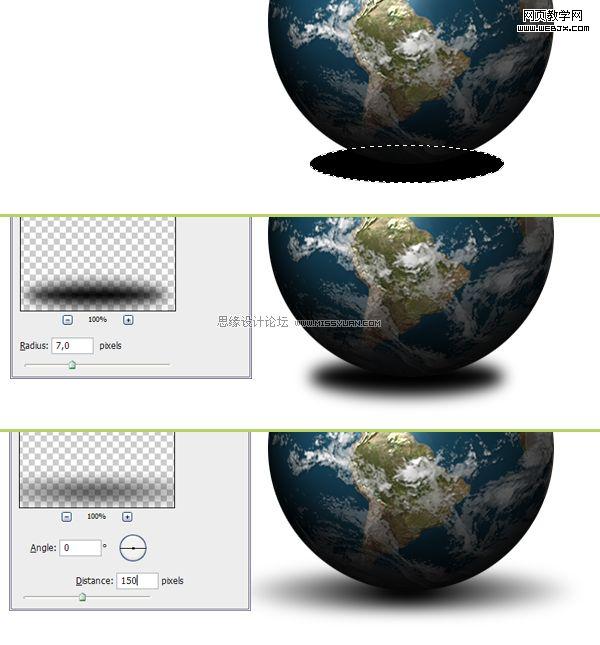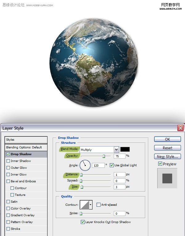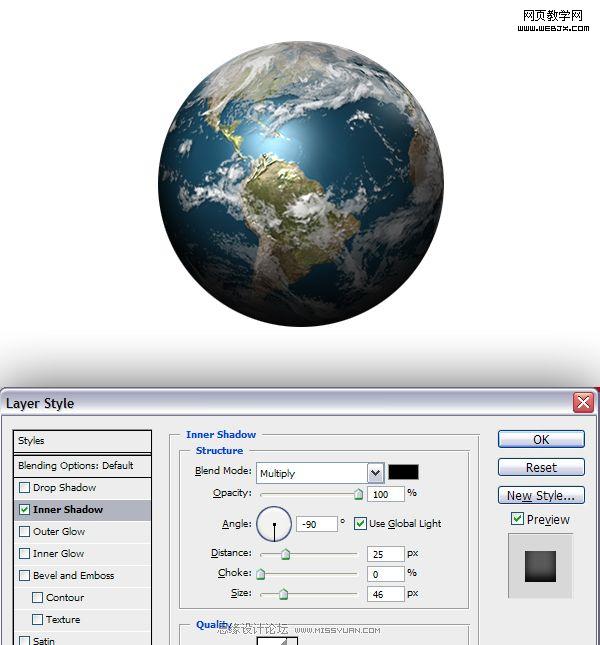 第十五步:用移動工具將地球向上移動一些,為投影和反射留出空間。對圖層使用一個內部陰影的圖層效果,并且使用如下設置:圖層混合模式為multiply,顏色設為黑色,不透明度為100%,角度為-90度,距離為25px,大小尺寸為46px,這會使球體的下部分變暗。