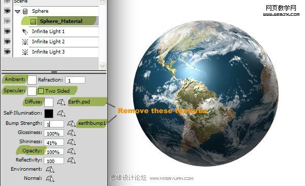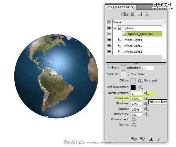 第八步:現在我們需要在地球表面加上凹凸貼圖。從planetpixelemporium.com下載"bump map"并保存在桌面上,在3d面板中點選sphere_material ,點擊編輯凹凸貼圖然后選擇讀取貼圖。選擇你剛剛下好的圖片。我們同時要讓我們的地球發光,所以將glossiness調整到100%。
