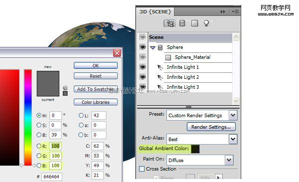 第七步:現在選擇global ambient color 然后將顏色設為r:100, g:100, b:100,然后確定。這會將地球周圍的顏色變亮一些。