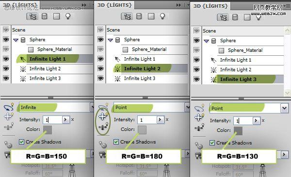 第九步:你可以看到在3d面板中有3個光源,這些是ps默認的場景光源。現在我們來改變它們的樣式,顏色和位置。選擇"infinite light 1"然后將它的顏色調整為 color to r:150, g:150, and b:150。選擇 "infinite light 2",將它的樣式調整為point以使我們能夠改變它的位置。將它的顏色調整為color to r:180, g:180, and b:180。選擇"infinite light 3" ,同樣的將它的樣式調整為point,顏色設為 r:130, g:130, and b:130。