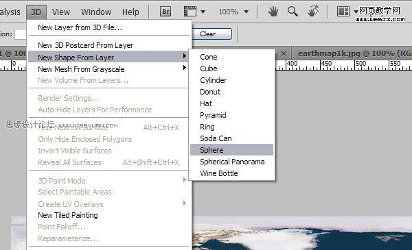 第三步:現在選擇:3d > new shape from layer > sphere。這樣就會將這一貼圖轉換成一個球體,這也是我們接下來工作的基礎。
