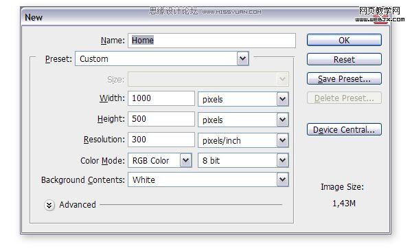 第一步:建立一個新的文檔,大小為1000像素乘以500像素,分辨率為300pix/inche,并且命名為"home"。