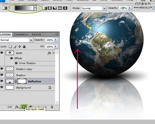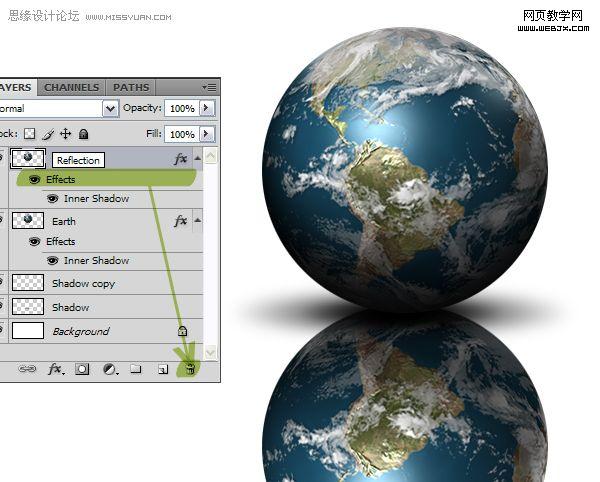 第十八步:在圖層面板中選擇地球圖層并且復制一層,命名為"reflection",刪去其中的內部陰影,選擇edit > transform > flip vertical來為圖像制作鏡像。將"reflection"圖層放置于"shadow"圖層之下,并且按下圖所示放置。