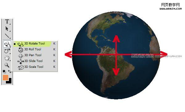 第五步:在工具欄中選擇3d旋轉工具,將地球旋轉到你希望的位置和角度,按住alt鍵或shift鍵將保持轉動時的軸不變。