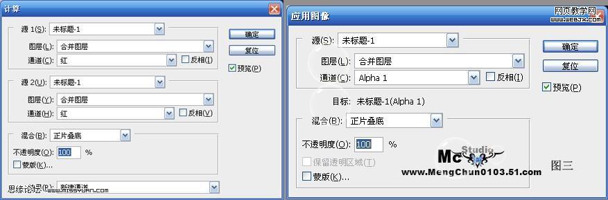 3.執行菜單命令“圖像”--“計算“,得到alpha1,再對alpha1“應用圖像”,執行菜單命令“圖像”--“應用圖像“,得到alpha2.如圖3: