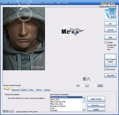 7.蓋印圖層(ctrl+alt+shift+e),感覺人物衣著還是有點蒙的感覺,在高反差保留銳化也不理想情況下,用一個外掛濾鏡topazadjust labs,網上可以找到。假如如何安裝,事情得自己解決,不能照顧得各位了。參數如下如圖八,采取默認狀態,假如感覺視覺效果需再深化一下,按ctrl+f或者用大家所說的:topaz銳化一下,效果更好。效果如圖九: