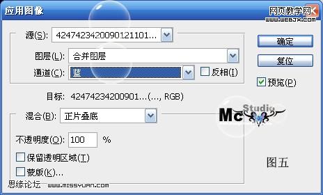 5.蓋印圖層(ctrl+alt+shift+e),執行“應用圖像”菜單命令,參數圖5,效果為圖六.