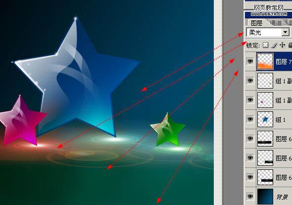 22、在圖層最上方新建一個圖層,混合模式改為【柔光】~這個圖層是我們的色彩調整圖層,我們用它來混合色彩~做出炫彩的效果。