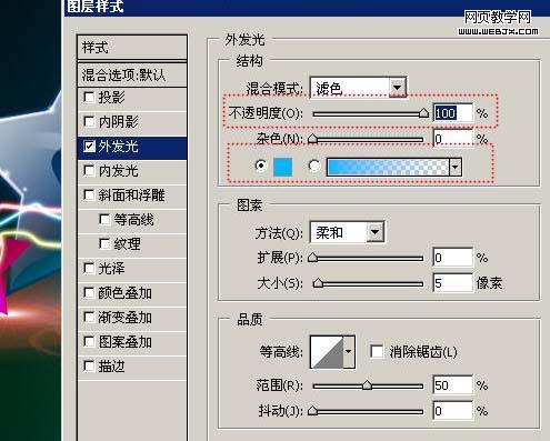 24、對制作好的路徑做描邊后還要做外發光效果~注意圖中的兩個參數都要調到100%。
