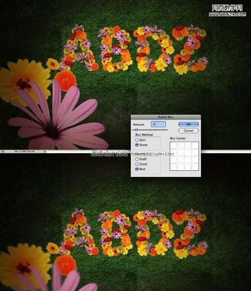 11、使用4中不同的花朵,讓她們漸漸的一個比一個大一點點,讓她們看起來想從空中落下來的感覺。花朵圖層一個一個疊加放置,每一朵花朵,都是用濾鏡--模糊---徑向模糊,數(shù)量為10,模式為縮放,質(zhì)量為最好。這樣我們就創(chuàng)造了一個漂亮有深意的田野效果。