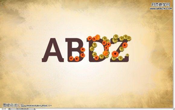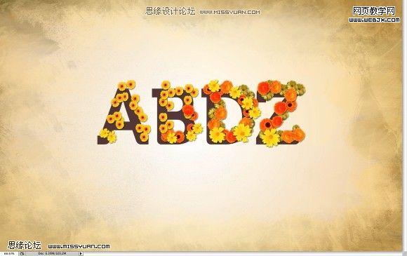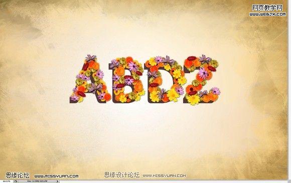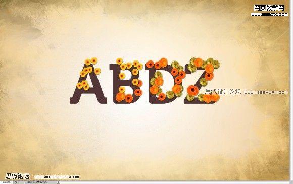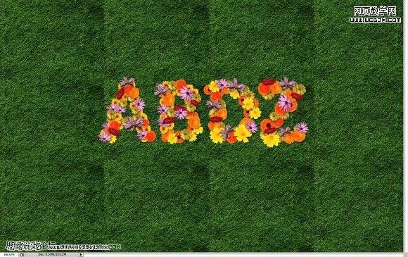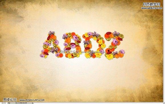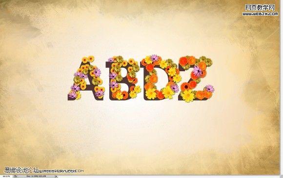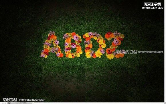 6、在字樣上混合多種色彩的花朵素材,創(chuàng)造一個花式字效。