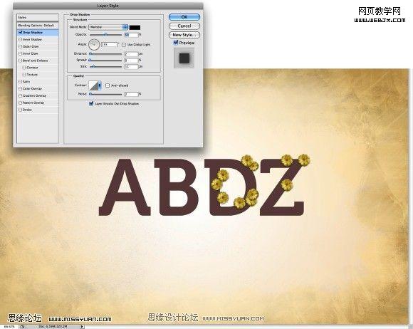 4、現(xiàn)在開始沿著字樣的邊緣,復制添加花朵素材。但是最先你要確定給花朵素材都使用圖層樣式,添加投影。陰影的混合模式為,正片疊底,50%不透明度,距離2,大小10。