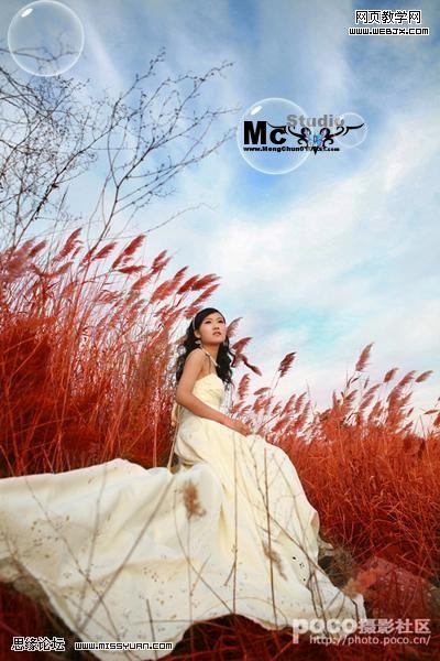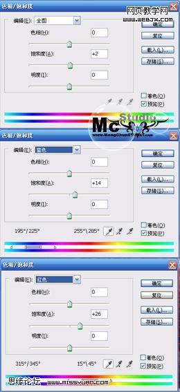 3.新建一個“色相飽和度”調整圖層,蒙版方面,注意用黑畫筆處理蘆葦與天空的銜接,人物所染紅色,注意畫筆的不透明度。設置與效果如下: