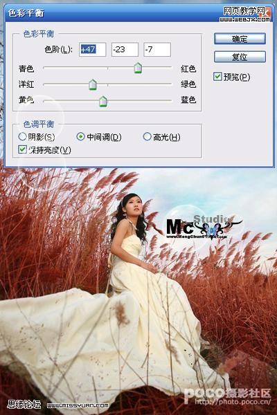 2.新建一個“色彩平衡”調整圖層,設置如下,只需保留蘆葦顏色,過渡方面,就要注意畫筆的不透明度。記得把原圖,放大到幾百倍,手工不好的人,想做細致就得這樣。如何擦拭,我就愛莫能助。寫這些,希望你能喜歡。效果如2: