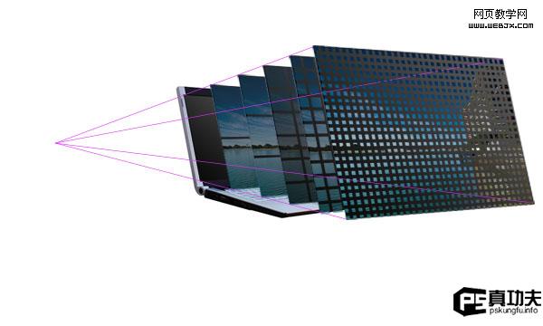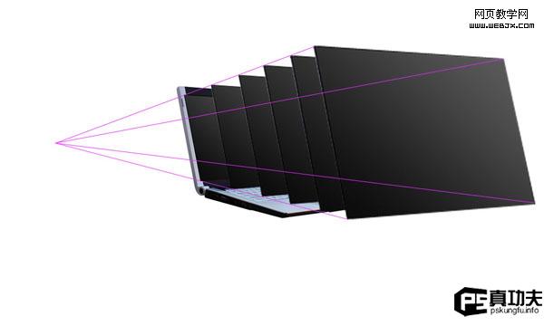 接著,把調整好的幾個屏幕放到透視正確的地方,不知道放哪?對了,輔助線就在那等你呢。不過記得把新添的這幾個屏幕圖層放在最大的屏幕圖層和原始屏幕圖層的中間。繼續添加其他大小的屏幕,方法如上。這次作者用的大小是80%,70%,60%(當然,這是相對最大的那個屏幕才是這個值。)注意各個屏幕的位置哈!