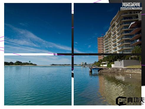 這步的關鍵是做出選取,然后刪掉選取里的內容就ok,其實很簡單,只是個人很少用到,而且不好表達(主要是我文底太差,勿怪勿怪,哈哈)。好了,我們繼續。復制圖層”photo 1”, 使用選取工具(m)–選擇單列選取工具,在圖的中間位置(中間在哪里?網格線不是告訴你了),垂直方向做個1px選區,按del刪了,同理使用單行選取工具在圖中間的水平方向做個選區,del之。接著你就看到如下的效果了(注:如果嫌做的選區太小,可以在你做好選區的時候進入選擇—修改—擴展—輸入你想要的數值來改變選區大小